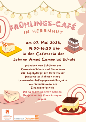 Am 7. Mai 2026 wird herzlich zum Frühlingscafé eingeladen. In der Zeit von 14:00 bis 16:30 Uhr erwartet die Besucherinnen und Besucher in der Cafeteria der Johann-Amos-Comenius-Schule in Herrnhut ein liebevoll vorbereitetes Caféangebot mit selbstgebackenen Kuchen und frischen Leckereien.